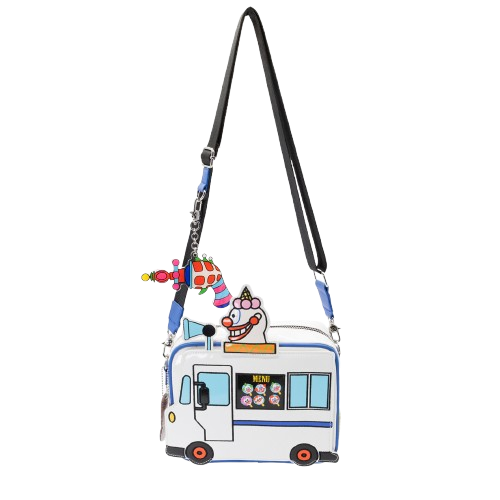 Ice cream truck crossbody with removable strap; D-rings on strap and side for trinkets; exclusive popsicle lining and exterior art; includes large acrylic ray gun charm.