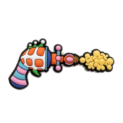 Shaped after the infamous ray gun from the movie, this pin combines metal with bright silicone details for a playful-yet-deadly pop of color. But the real killer feature? It glows in the dark, bringing the terrifying weapon to life under blacklight or in the shadows—just like when the Klowns stalk their next victim. The back of the pin is stamped with Limited Edition 600 and finished with the official Whatever! Makes You Happy exclamation pattern, proving it’s a true WHMH exclusive.
