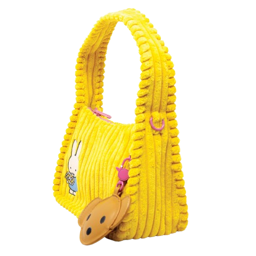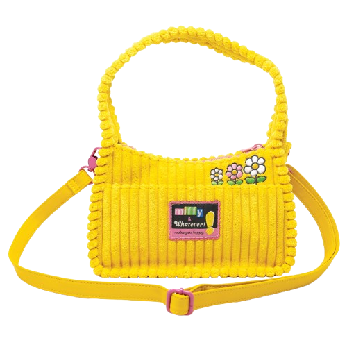 Yellow corduroy baguette crossbody with Miffy embroidery and floral detail. Back pocket fits any phone. Includes PU bear-shaped charm.
