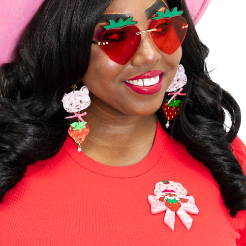 Layered acrylic pin with dimensional head and strawberry; oversized pink bow; modern take on a classic.