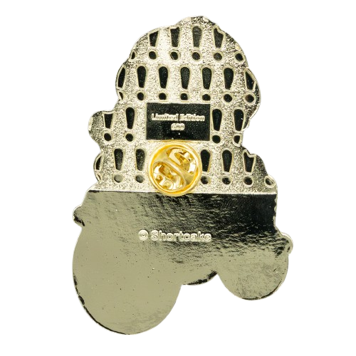 Very limited pin with strawberry-scented silicone; gold backing stamped 'Limited Edition 600' and branded exclamation pin back.